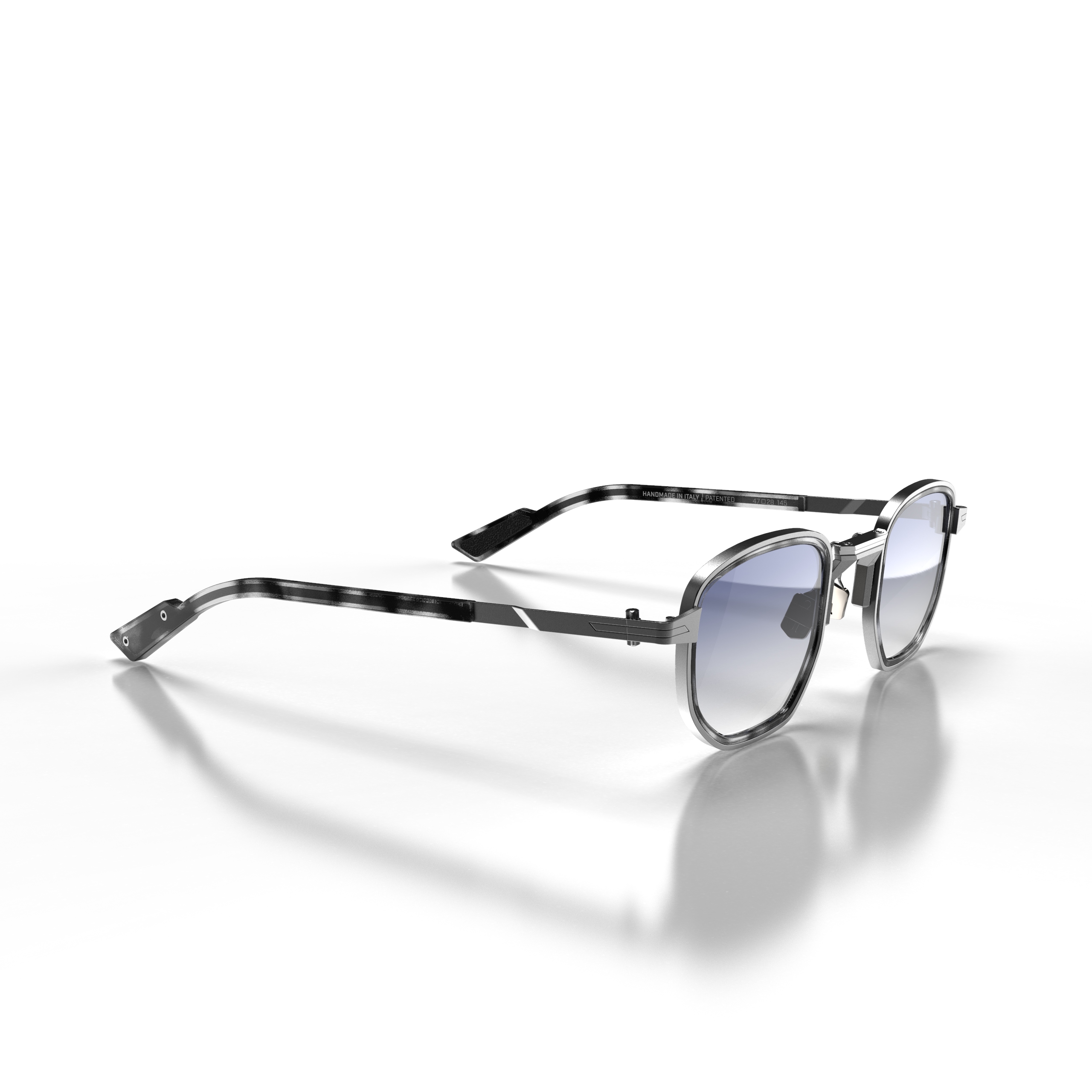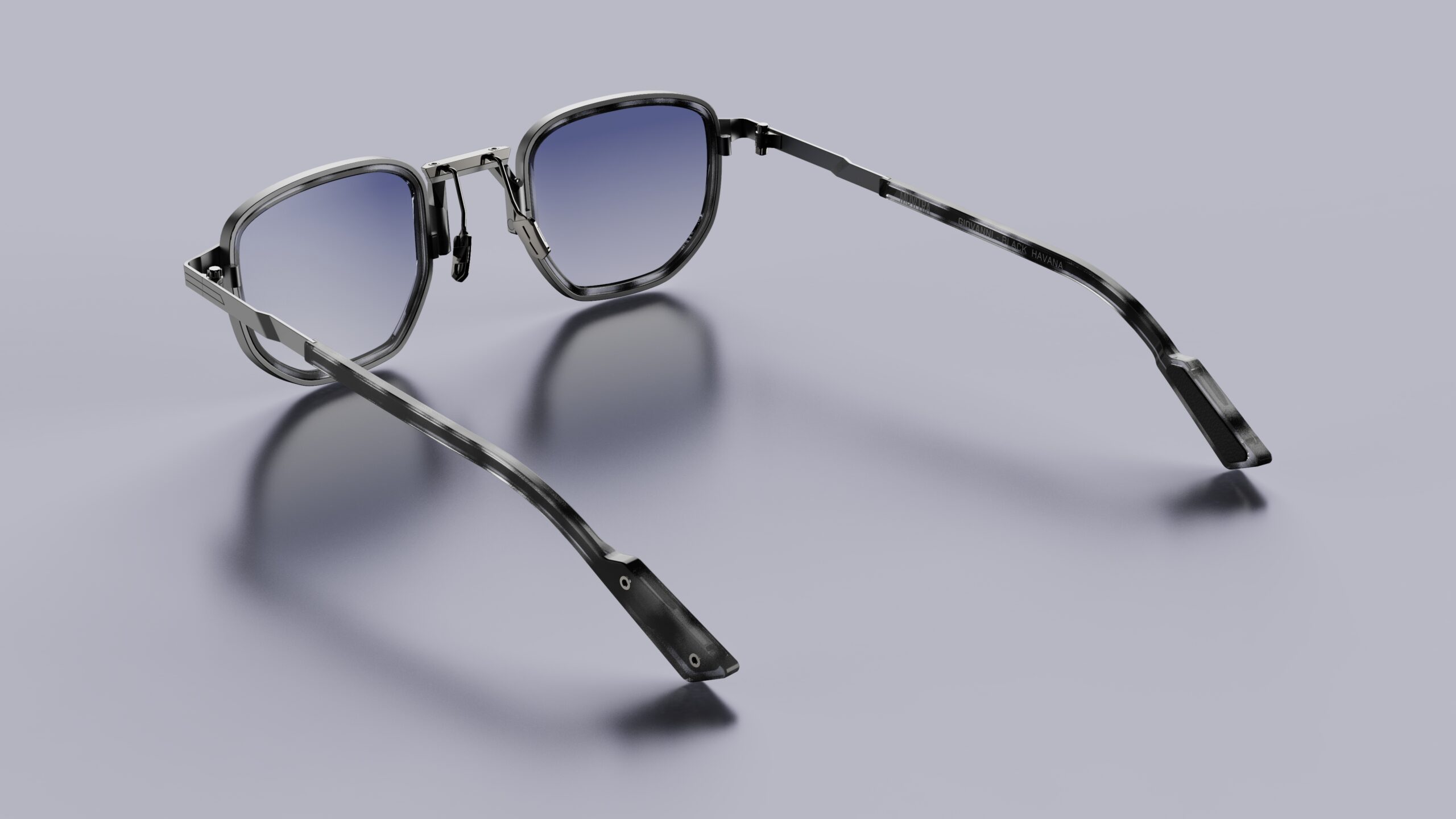 Part of the Combo Collection, Model GIOVANNI offers a smart, slightly softened square eye shape, in acetate, titanium and stainless steel. The frame comes in Black Havana acetate with galvanic finishing in Gun Metal and Light Gun and a Flash Electric Gradient Light Blue sun lens or Havana acetate with galvanic finishing in Gun Metal and Light Gun with Green lenses. The frame also has the new bridge design, created from a mould and an integrated mechanism and insert with double galvanic finish on the upper section.