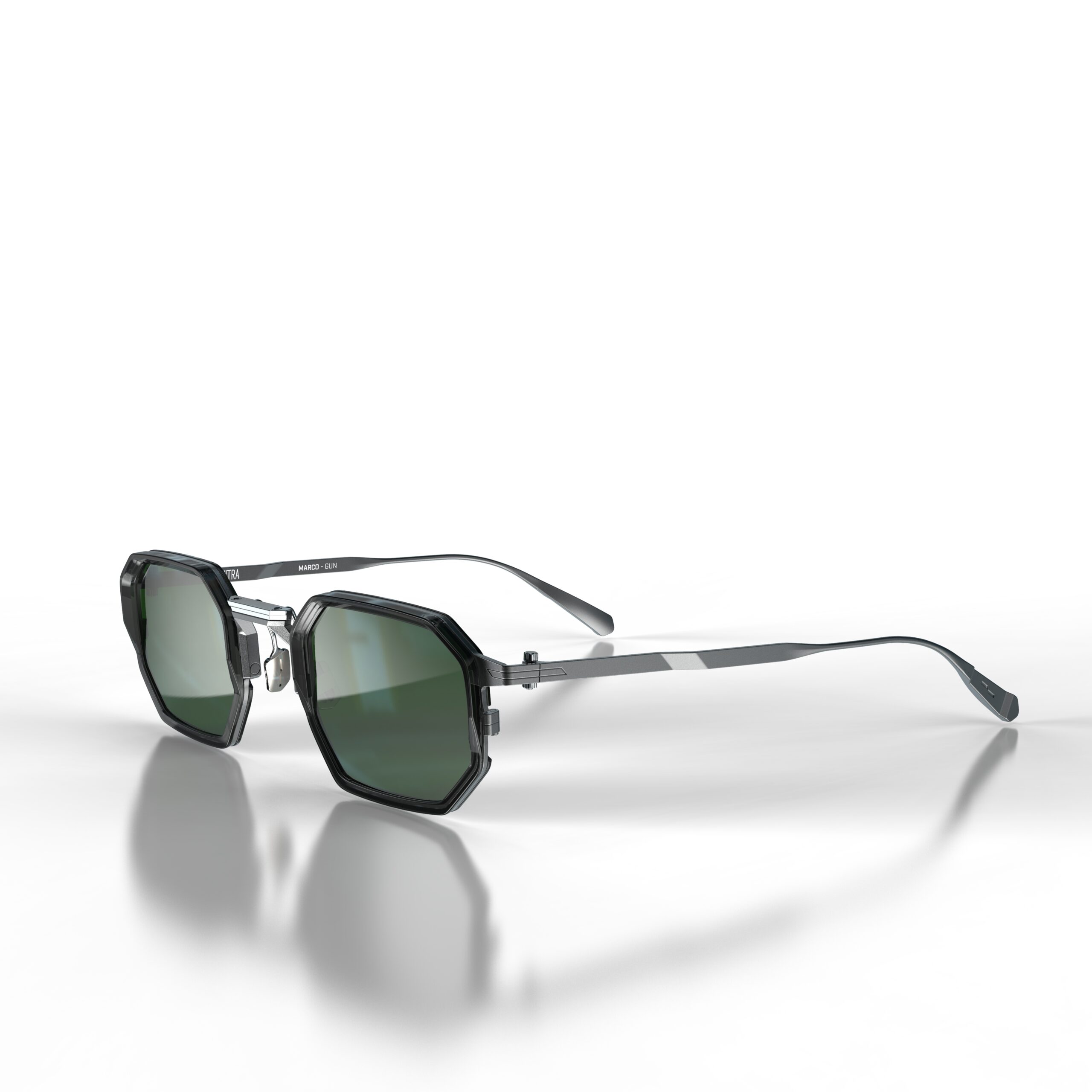Model MARCO is a geometric design, featuring a slick combination of acetate, titanium and stainless steel. The frame features the innovative galvanic finishing with colourways of Gun Metal/light gun with Crystal Black and Flash Electric Gradient lenses and Gold/light gun with Crystal Sand acetate and Flash Electric Gradient Light Blue lenses.
